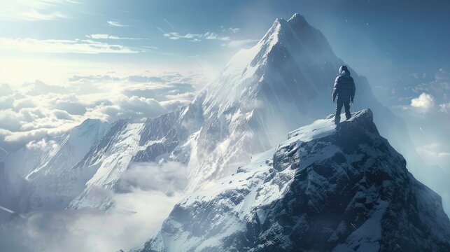 A man never gives up, strength and power. A man feels determination to climb a steep mountain.