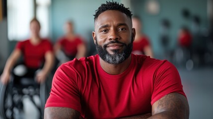 A focused and strong man in a red shirt poses proudly in a sports training environment, showcasing the strength and determination of athletes with disabilities.