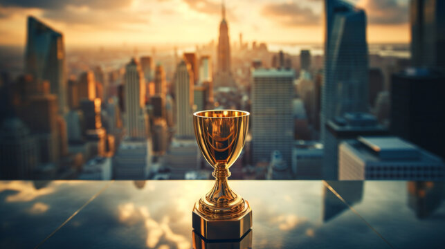 Champion golden trophy city background. Success and achievement concept. Best entrepreneur, startup