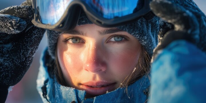 Young woman in frost-covered ski jacket adjusts her goggles, face lit by winter sun. Confident focus and resilience in cold outdoor setting.