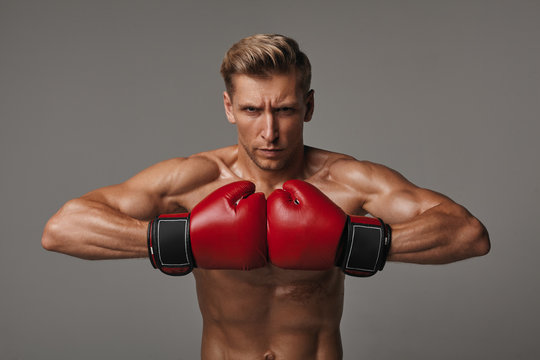 Muscular male athlete in a boxing ring, ready for a fierce combat, his determined expression reflects strength and the profound challenge of competitive sport