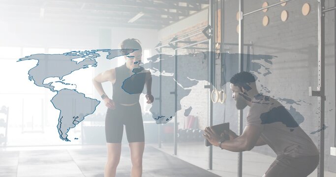 Training woman in sportswear performing squat at gym with coach timing via phone, rig, map overlay