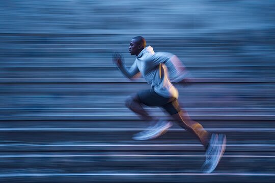 A dark-skinned man in a light grey hoodie and dark shorts sprints past a blurred urban backdrop at night, his motion captured in a dynamic, streaked image