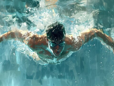 Artistic depiction of a swimmer executing the butterfly stroke in a pool, with splashing water and dynamic movement.