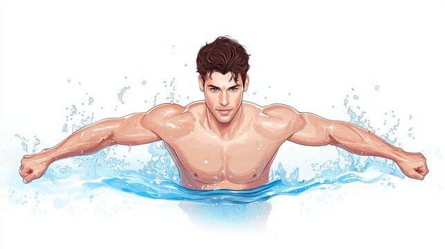 Aquatic Grace: A muscular male swimmer executes the butterfly stroke through the water with effortless skill and grace, creating dynamic splashes around him.