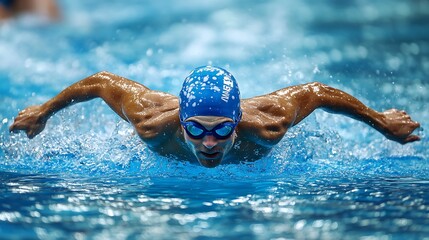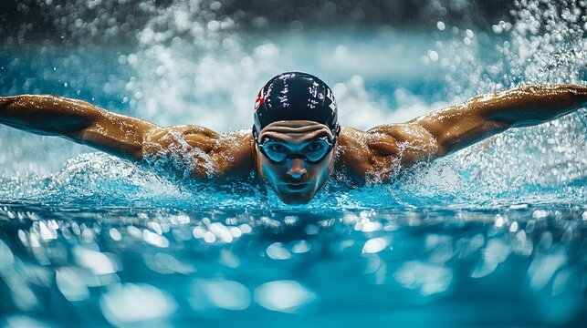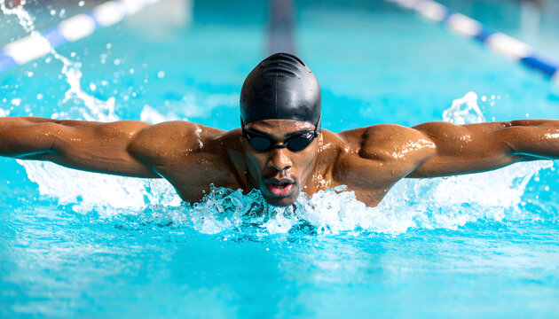 A young male swimmer executes a powerful butterfly stroke in a competitive swimming pool lane. Concept of athletic prowess and competitive spirit in aquatic sports.
