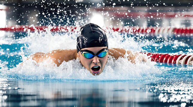 Focused Swimmer in Pool: A determined female swimmer executes a graceful butterfly stroke in a serene indoor pool, embodying athletic prowess and the embodiment of intense focus and dedication.