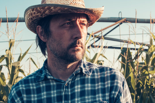 Portrait of confident successful farm worker in corn field