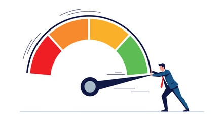 Drive performance with a determined businessman pushing the gauge towards success in this dynamic business illustration, showing progress improvement