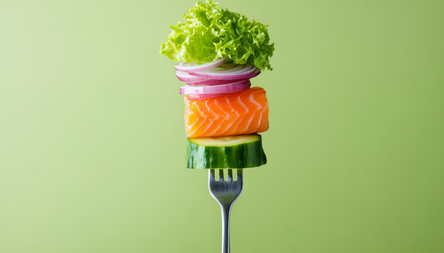 Close-up of fork with food on it: delicious fillet salmon, cucumber, onion, green salad on green background. Concept of healthy diet and clean eating, balanced nutrition space for text