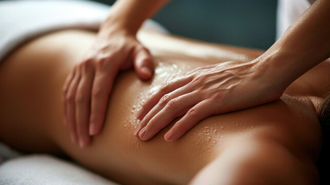 Body massage treatment. Woman having massage in the spa salon. Masseur working on his back.