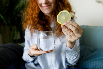 Young woman morning at home near the window drinking water with lemon, vitamin drink in winter spring season