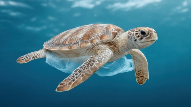 A Sea Turtle Swimming Gracefully Underwater with a Plastic Bag Entangled Around Its Flippers in the Depths of the Ocean