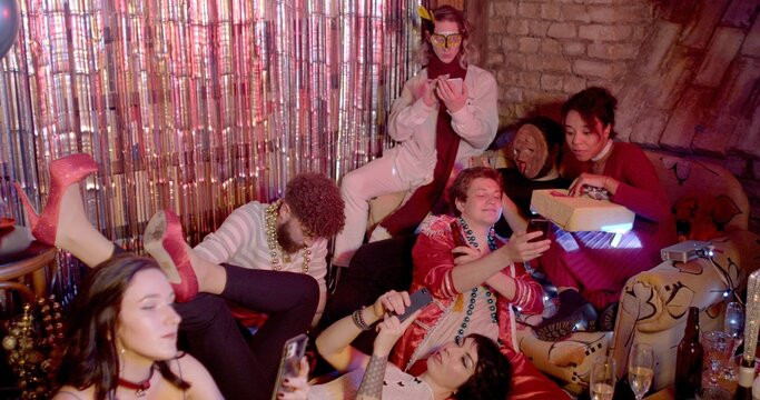 Text messages while hangout friends, online texting detriment live communication. A lot of people lie on the sofa relax use phones during party. No being physically and emotionally involved company.