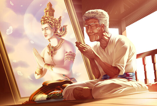 a buddhist old man is offering alms to monks and practicing dhamma at a Thai temple with great faith in the belief that this will lead him to be born as a deva in heaven