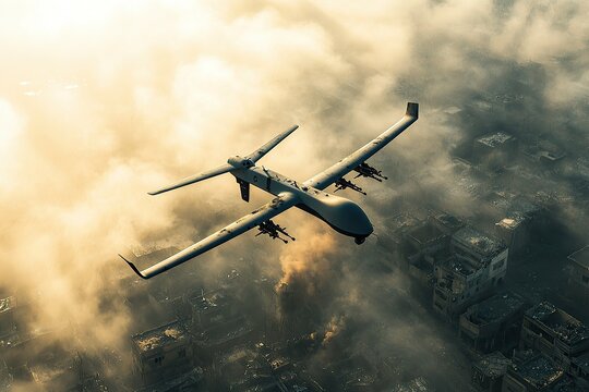 An unmanned aerial vehicle soars above a devastated urban landscape shrouded in smoke and haze.