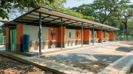 Modern public sanitation facilities in a developing country, showing clean and accessible toilets and washing stations
