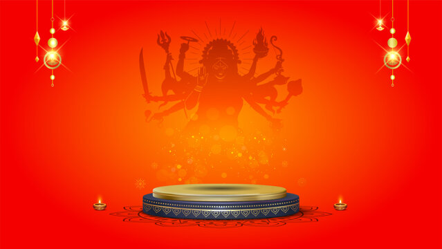 Vector illustration of Podium and goddess durga devi on red background for indian navratri festival puja 2024.