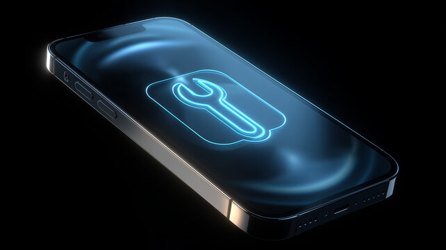 A tilted smartphone with glowing wrench symbol representing mobile diagnostics and digital troubleshooting for smart device maintenance.