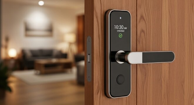 A contemporary smart door lock in a residence is shown with a sleek black and silver finish.