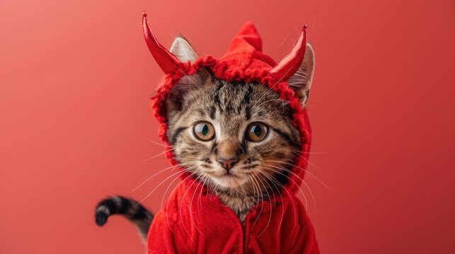 Close-up of a cat dressed as a devil for HALLOWEEN, showing tiny red horns and a tail, wearing a tiny red costume, standing in front of a red background, Portrait close-up, hyper-realistic, high