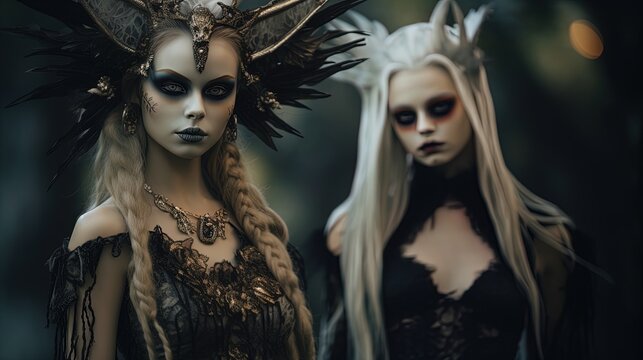 Step into a dark fantasy realm as two Halloween girls don mesmerizing fancy dress costumes. They embody haunting figuratism in the style of devilcore, set against a striking light brown.