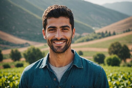 Close portrait of a smiling young Lebanese male farmer standing and looking at the camera, outdoors Lebanese rural blurred background