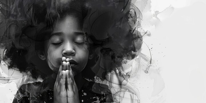 A woman with curly hair offers devoted prayer, her hands clasped, as soft light highlights the peaceful atmosphere around her