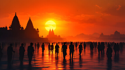 Ritual sunrise festival banner, red–yellow gradient, silhouettes of devotees by river