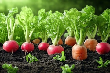 Row of red radishes and small orange carrots pushing through dark soil with dewy green tops, bathed in soft morning light conveying freshness and abundance