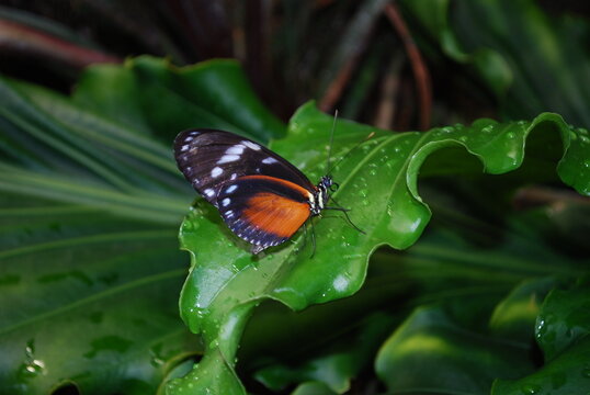 Close-up of a ladybug on a dewy leaf against a sunrise