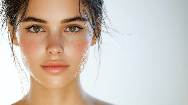 Close-up of a beautiful dewy fresh skin Caucasian woman in her 20s, looking at the camera, the model has long brown hair, professional lighting shot on the studio background