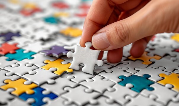 Close up of hands carefully assembling a jigsaw puzzle on a patterned surface