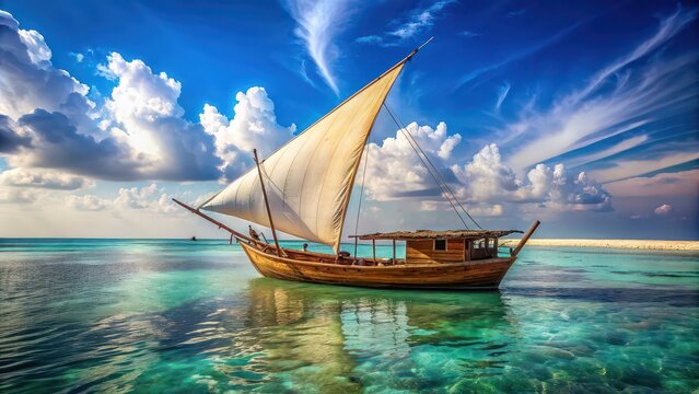 Tranquil dhow sailboat on shallow turquoise water, beside a pristine white sand beach