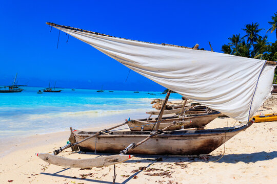 Traditional wooden dhow boats ashore on tropical sandy Nungwi beach in the Indian ocean on Zanzibar, Tanzania