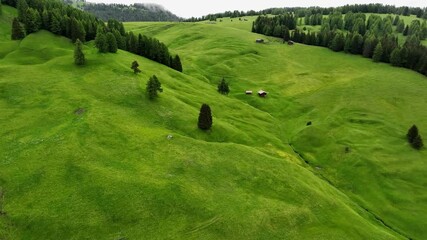 Aerial view of Alpe di Siusi with Sassolungo, Dolomites, Italy