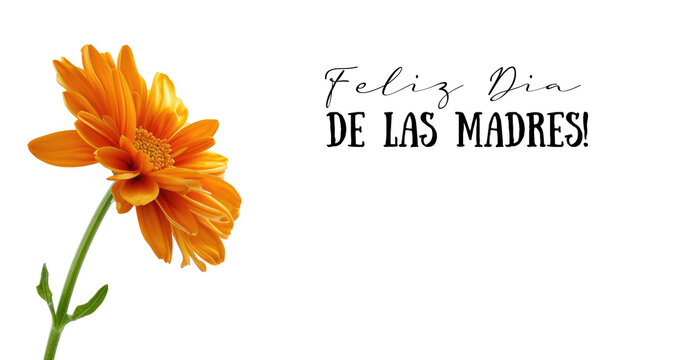 A single orange flower with the words feliz dia de las madres. It means Happy Mother's day in Spanish.