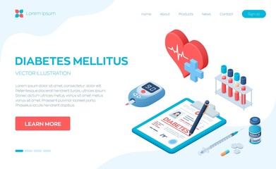 Diabetes Testing with Blood Glucose Meter, Exam Results, Tubes, Syringe to Medical Healthcare and Treatment For Poster Background Vector Illustration