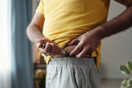Unrecognizable person using insulin pen to control glucose level at home