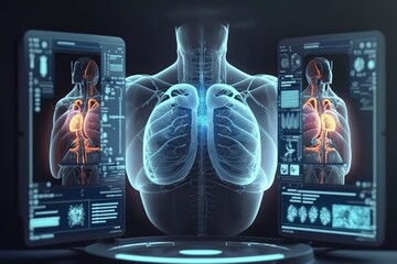 Virus, robotics research diagnose virtual Human interface screen. Generative AI illustration.