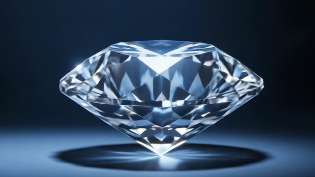A brilliant-cut diamond sits on a dark blue surface, casting a reflective shadow. Its facets shimmer, catching the light, exhibiting exceptional clarity and sparkle