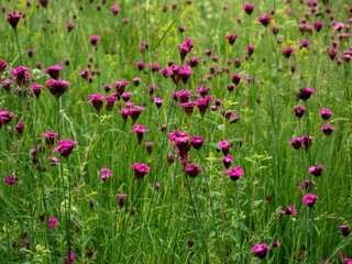 Beautiful view of dianthus carthusianorum pink flowers with green grass on sunny day in meadow