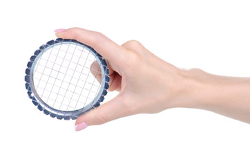 Metal grid vegetable cutter in hand on white background isolation