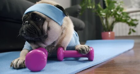 Funny cute pug dog do fitness at home. Cute face. Funny lazy sport pug. Tired of training, lying on the mat. Falling asleep with dumbbells in the paws. Funny dog sport and laziness concept