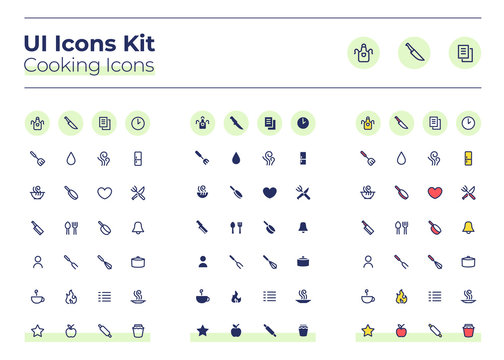 Cooking UI icons kit. Meal preparation thin line, glyph and color vector symbols set. Dinner recipe. Fork and plate. Food mobile app buttons in mint circles pack. Web design elements collection