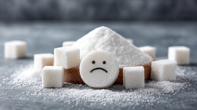 Sad smiley face on sugar cube with pile and melting cubes on gray background for health awareness