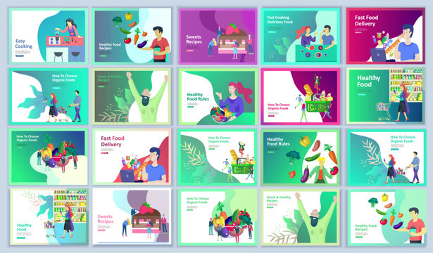 Landing page template with Happy People with vegetable and healthy food, jumping and dansing. Veggie recipe, vegetarian diet and detox concept, eco friendly lifestyle. Colorful