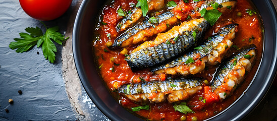 A keto friendly meal option featuring sardines cooked in tomato sauce and spices for lunch or dinner ideal for a diet plan Includes copy space image