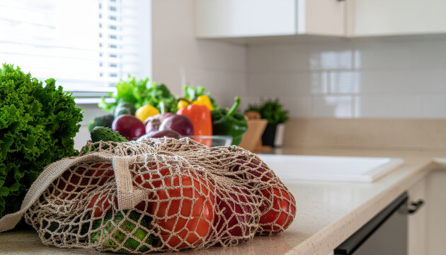 Zero waste beauty packaging concept with fresh vegetable kitchen counter reusable mesh bag eco friendly home natural light healthy food organic diet modern interior