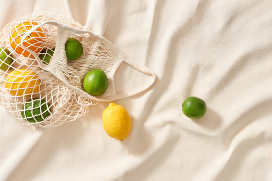 Hand holding smart phone with blank screen at Eco friendly reusable shopping bag with fresh organic vegetables on kitchen table. food delivery, online shopping app, farm products. customer reviews